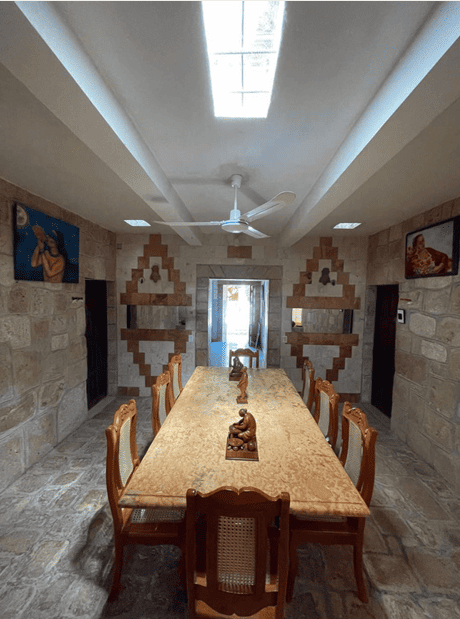 Tiene una mesa de trabajo construida con madera de cedro y está iluminada por dos amplios ventanales. Su pared frontal tiene en su parte baja un recubrimiento de antiguos ladrillos rojos rescatados de una ex hacienda henequenera.