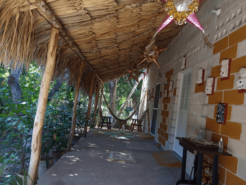 La palapa de las mariposas es un excelente lugar de descanso dónde se tiene una conexión con la naturaleza. En la zona de las cabañas se encuentra el corredor de las máscaras, con hamacas y una sala rústica para descansar o escuchar el canto de los pájaros que abundadn en el jardín de la casa.